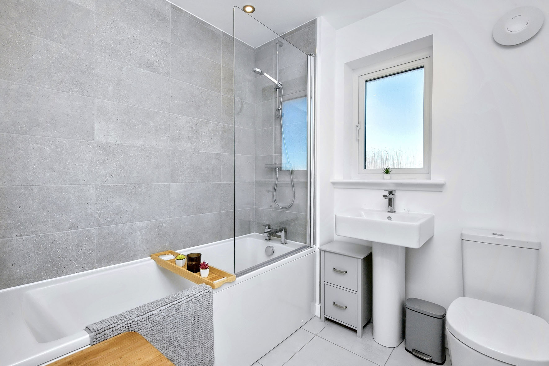 • Bright bathroom with shower-over-bath