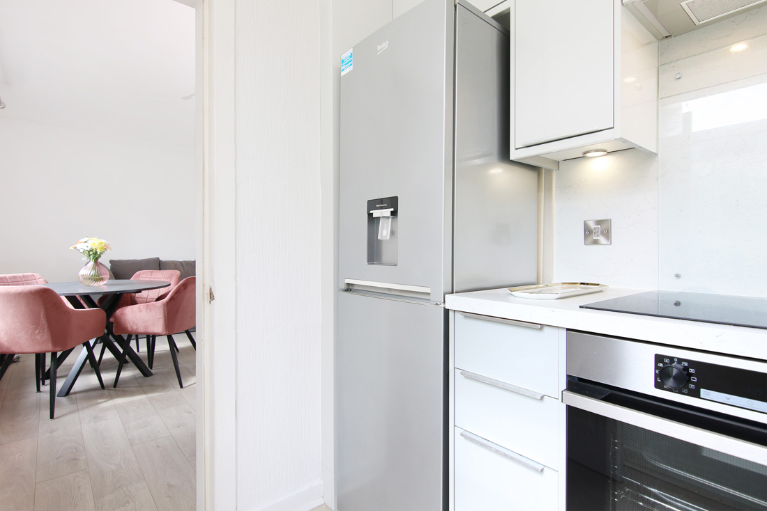 The entrance is tucked away to the side, where you are greeted by a welcoming hallway. A spacious lounge/diner is flooded with natural light from a south-facing picture window, which overlooks the rear garden and the perfect setting for modern family life or entertaining. Adjacent, is a modern kitchen, an airy room lined with sleek gloss cabinets.