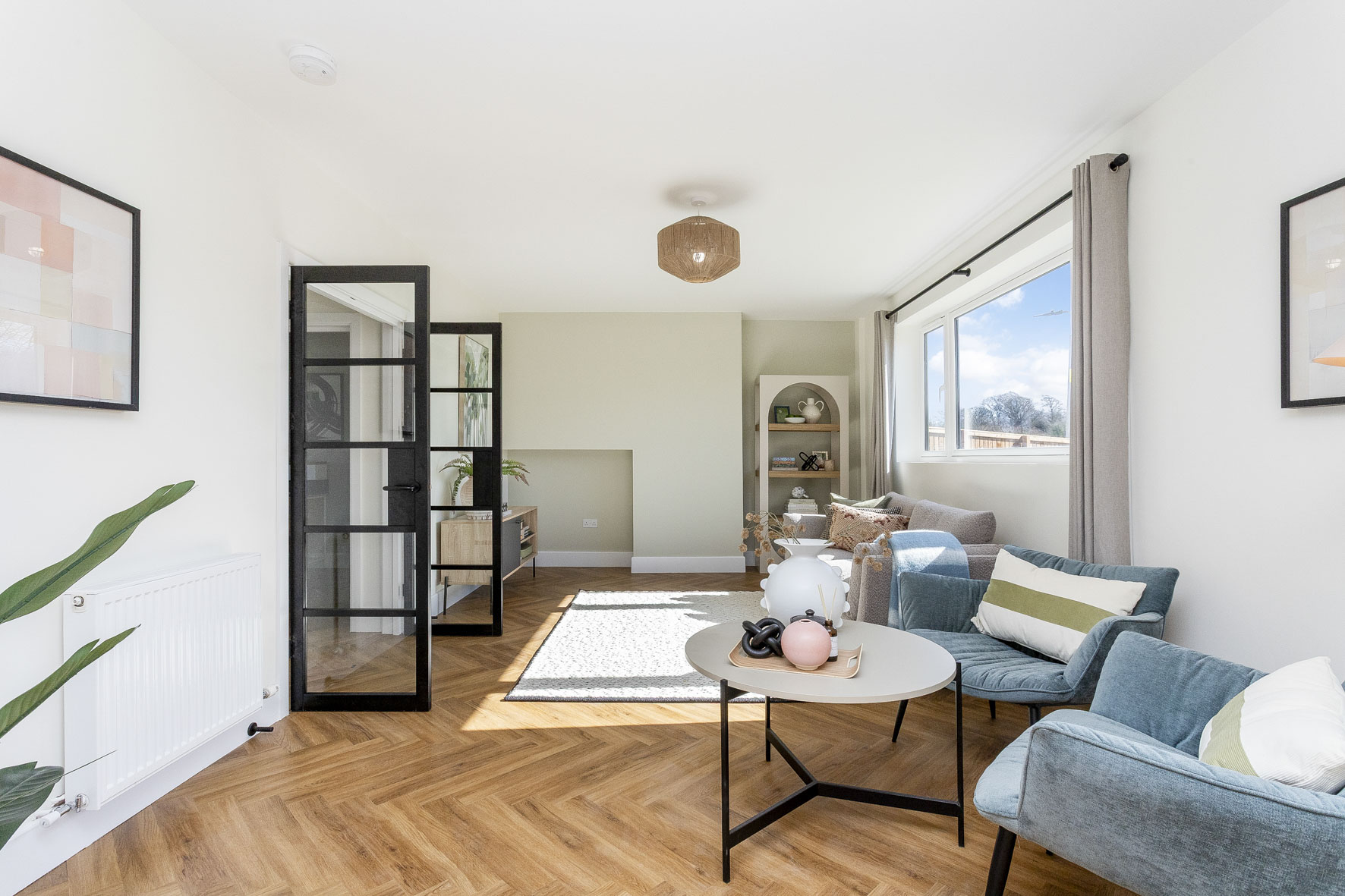 - Stylish Living Room with black glass internal doors