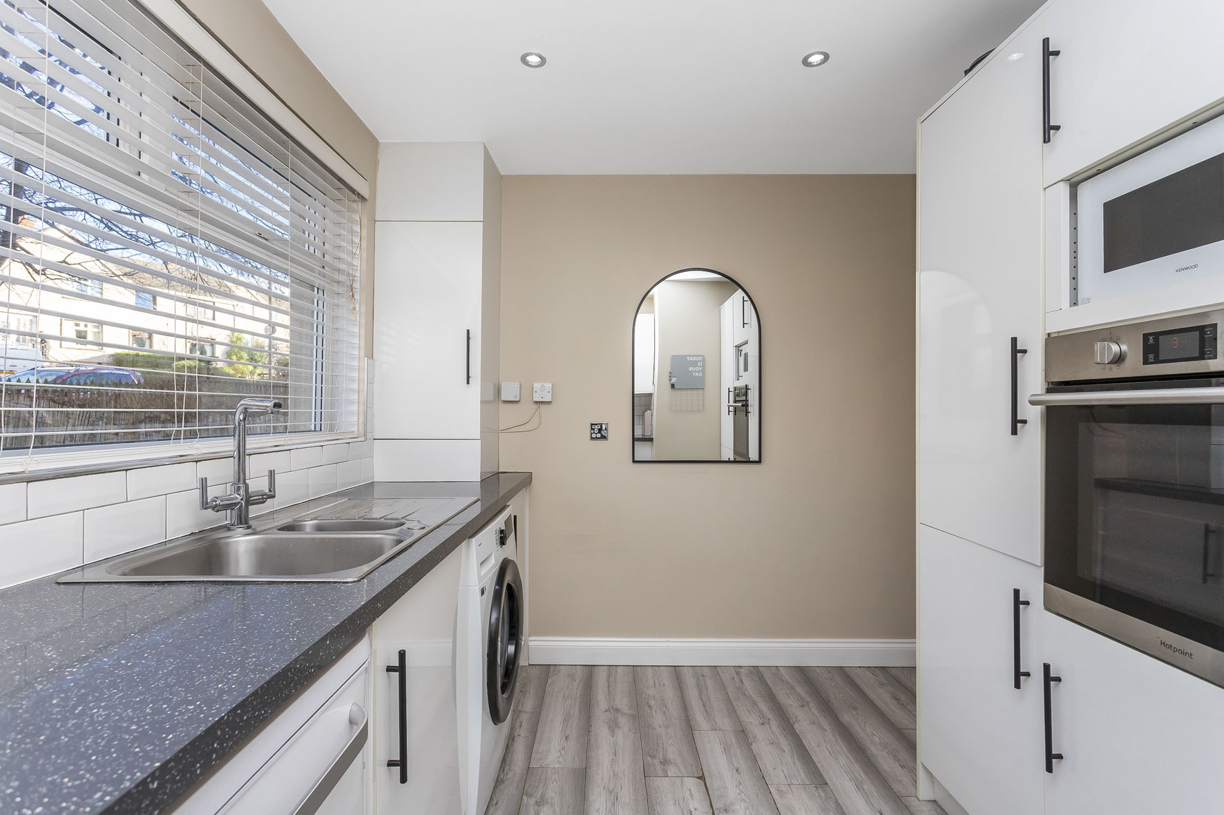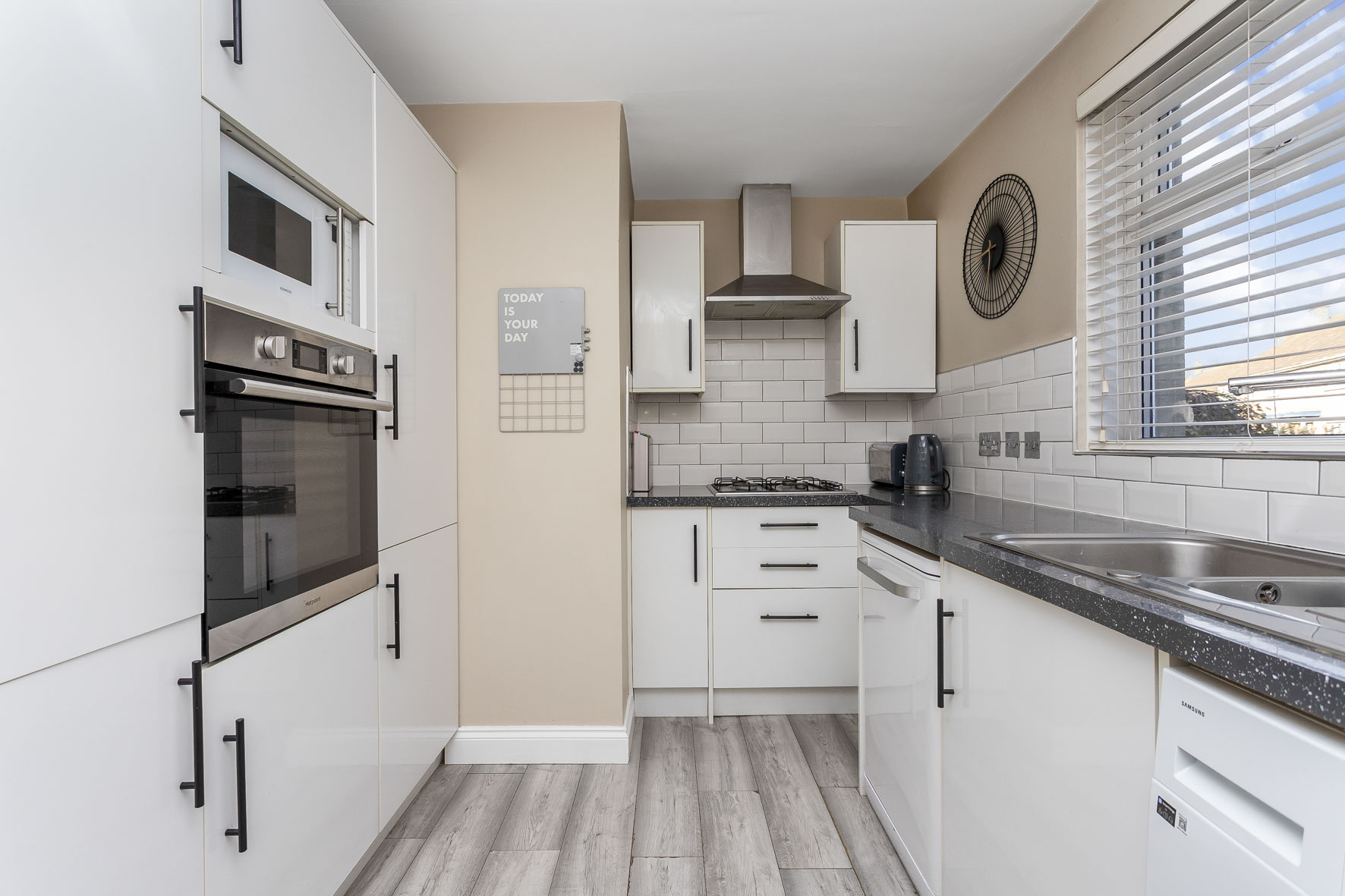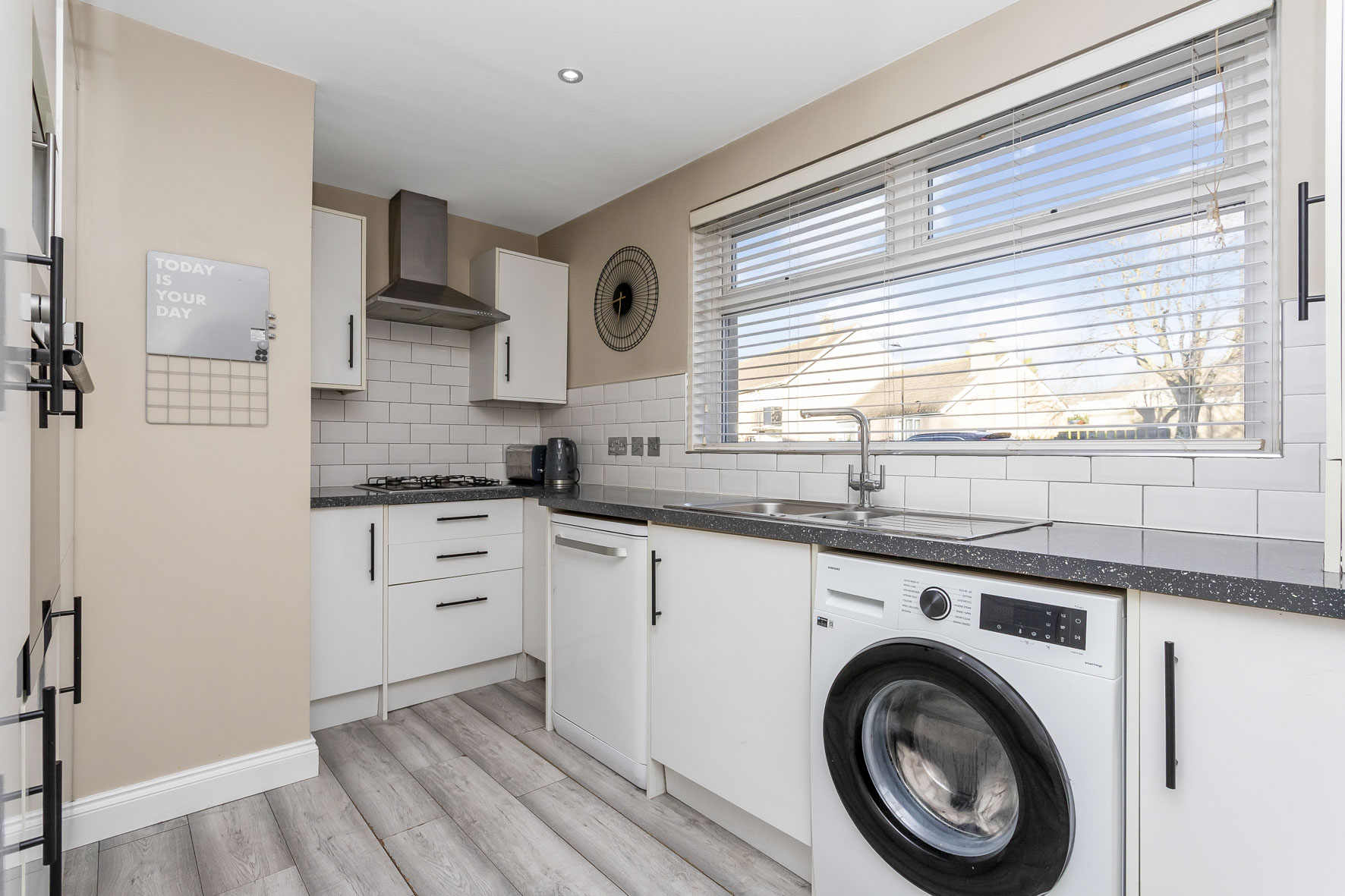 Sporting a fashionable design, the kitchen is fitted with white cabinets alongside matching metro-style splashbacks and granite-inspired worktops. It provides generous storage and workspace, and is further complemented by the subtle décor.