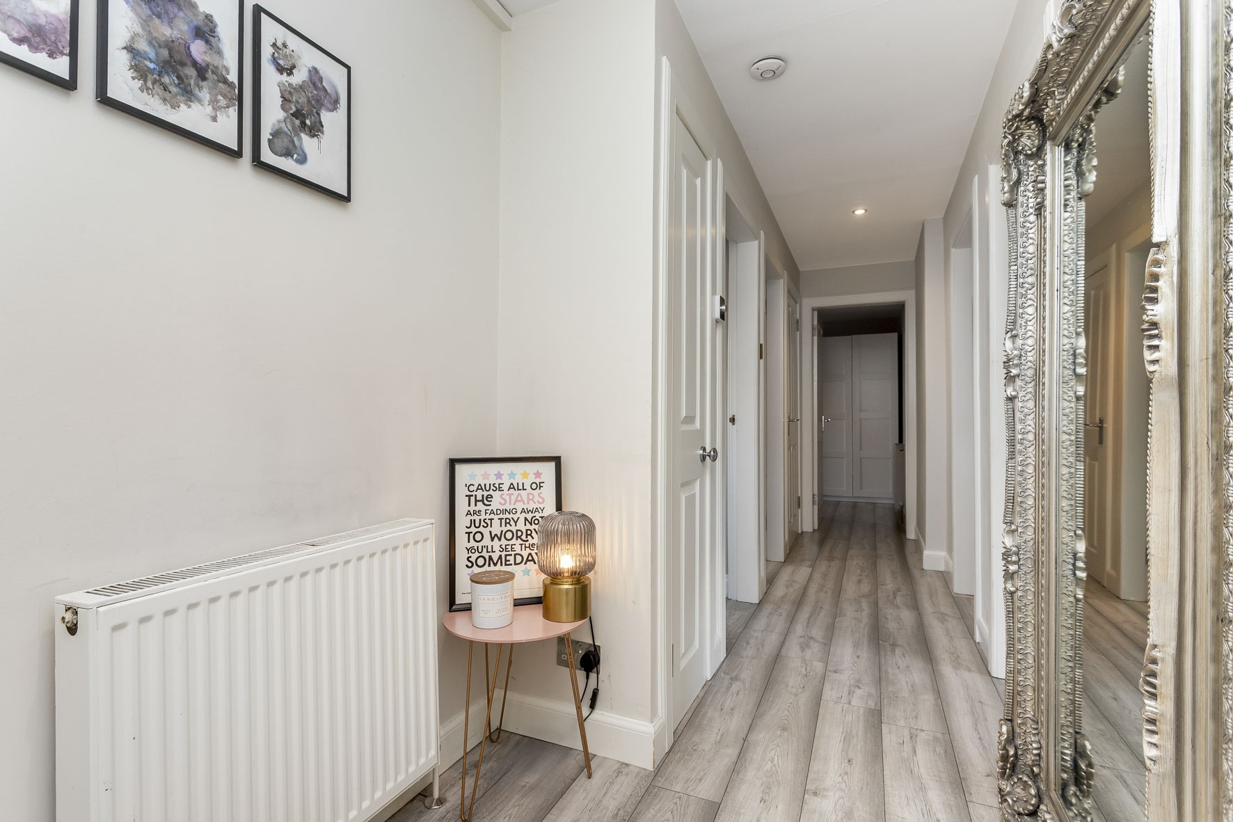 Accessed via a shared entrance, the home’s front door (with storage adjacent) opens with a delightful first impression into a hall, defined by light décor and a muted, wood-toned floor (which is found predominantly throughout). It offers practical storage and sets the standards for the accommodation to follow.