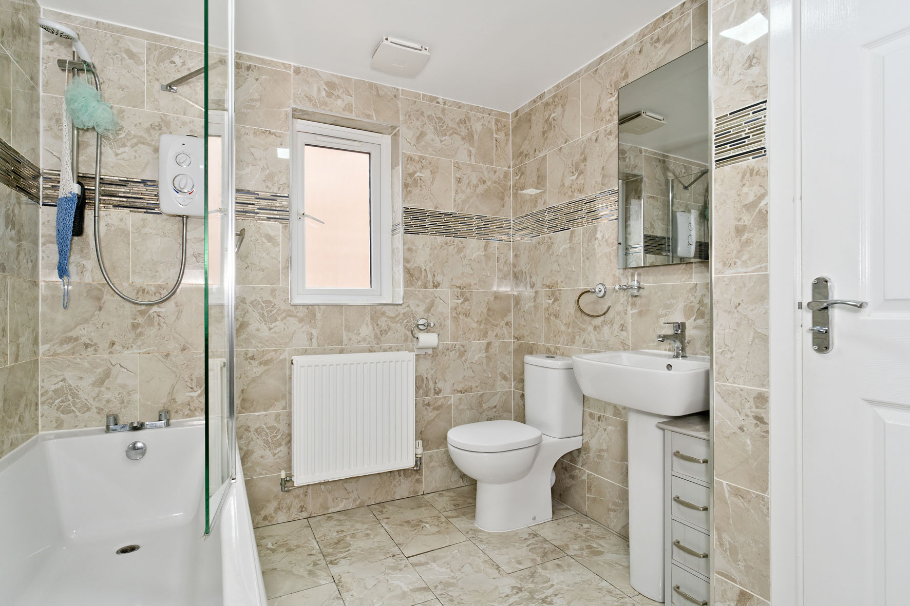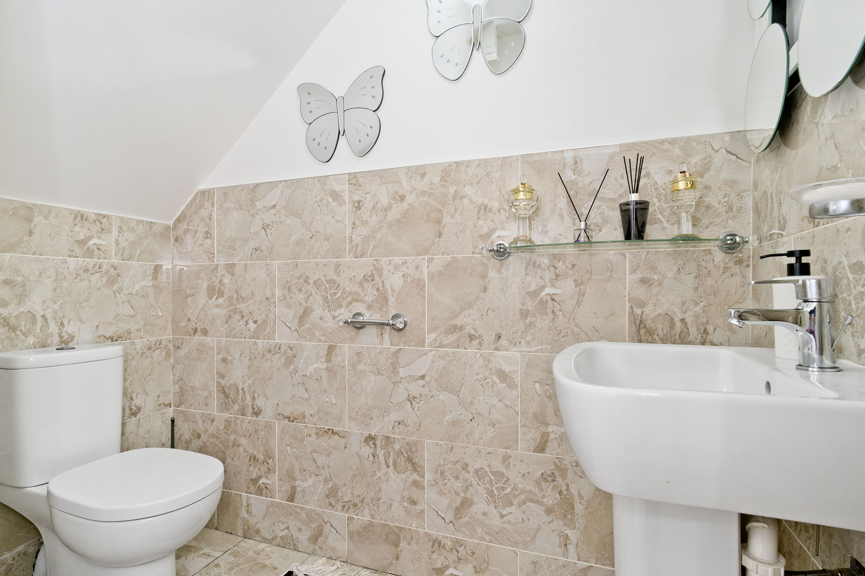 The four main bedrooms are on the first floor. These include the large principal suite, which boasts a Juliet balcony and an en-suite shower room with built-in storage, two additional double bedrooms (one with a built-in wardrobe), and a flexible single bedroom. All have attractive décor and oak wood floors that are easy to maintain. A premium family bathroom, with an overhead shower and quality tile work, finishes the accommodation. Gas central heating and double glazing ensure year-round comfort.