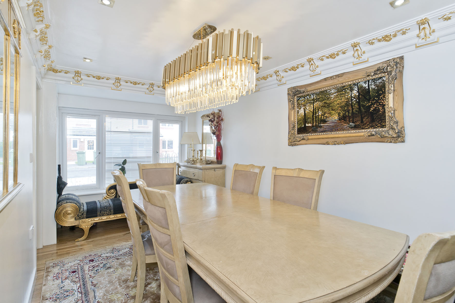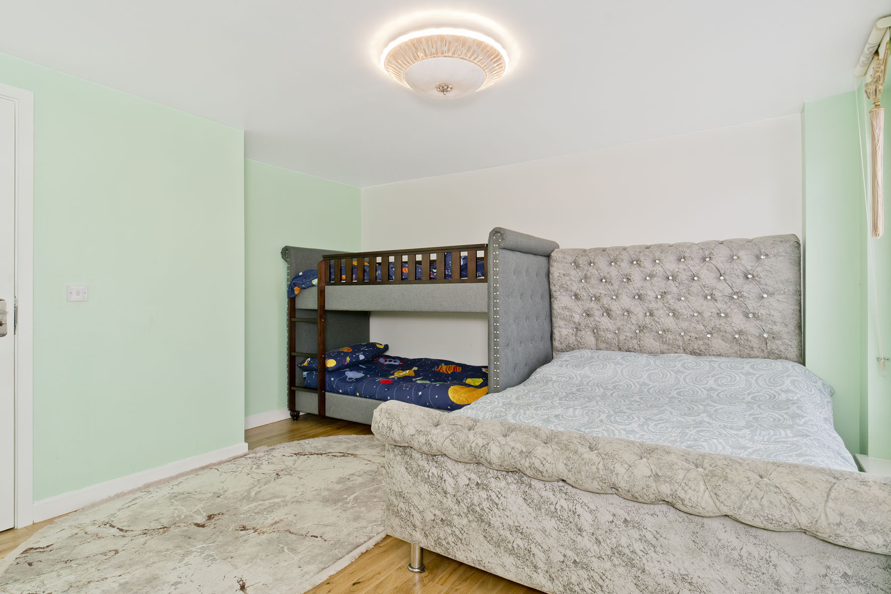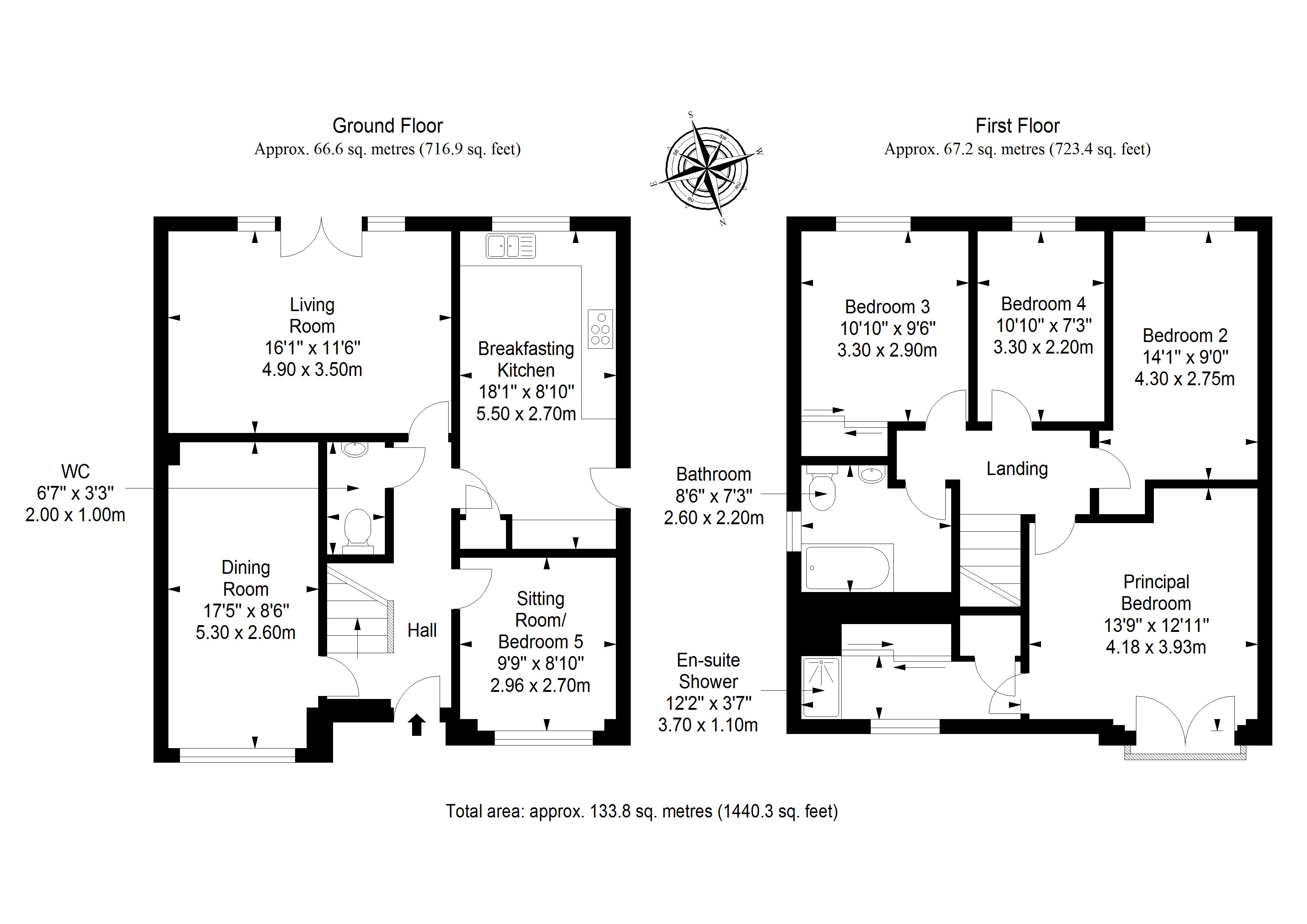 Mirroring the aesthetic of the living area, a well- proportioned dining room provides a second reception space for family meals and entertaining. Meanwhile, the breakfasting kitchen has a spacious footprint to accommodate another table and chairs. It has a modern design, fitted with generous cabinet storage and workspace, as well as integrated appliances (oven, five-burner gas hob, concealed extractor, and dishwasher) and a freestanding fridge/freezer. The ground floor is completed by a versatile sitting room/fifth bedroom.