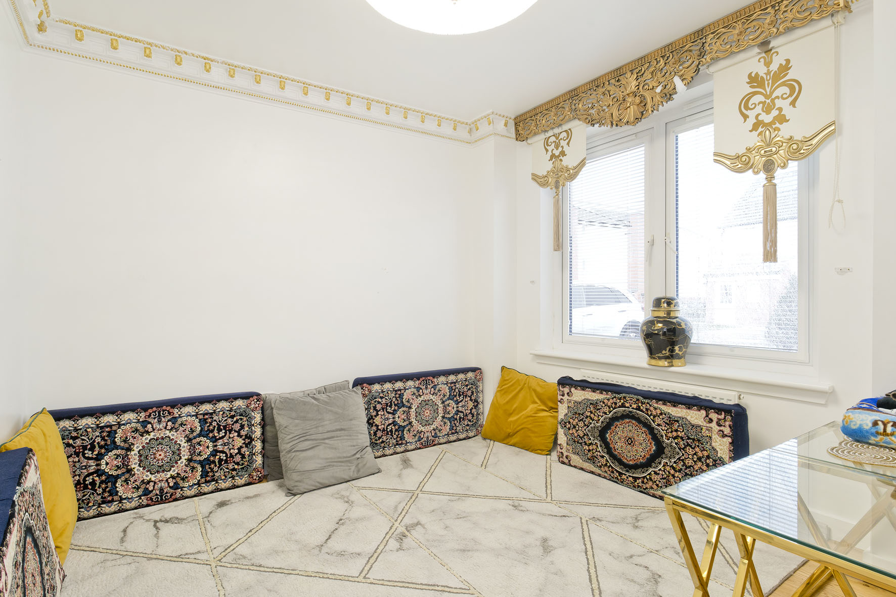 Nestled behind a well-maintained front garden, the home’s main door opens into a central hall with a WC. Directly ahead is the living room. Here, crisp white walls are paired with a solid oak floor, creating an appealing blank canvas that is easy to style. Intricate cornice work and an attractive ceiling frieze add texture to the room, whilst south-facing French doors to the rear garden ensure a light-filled ambience.