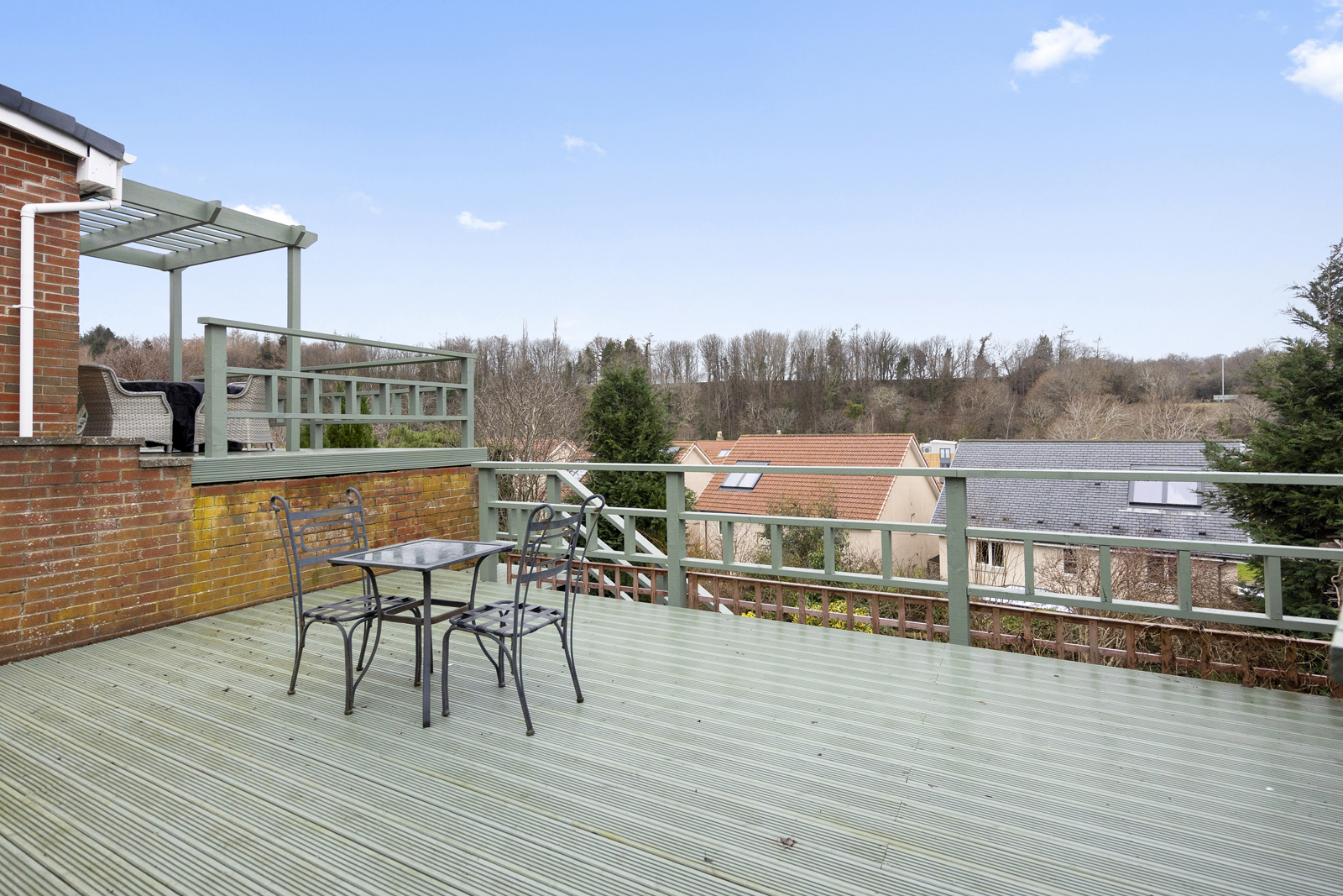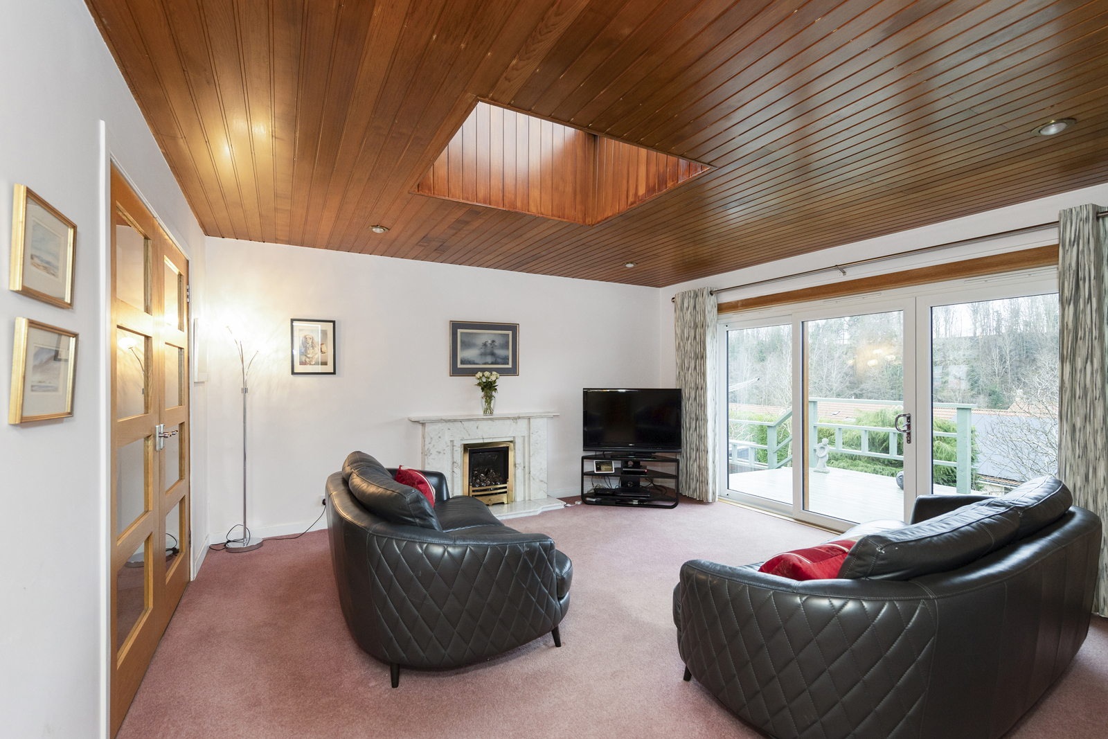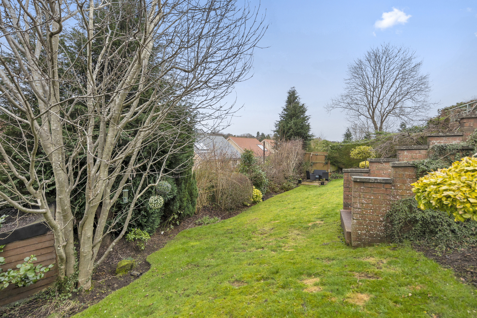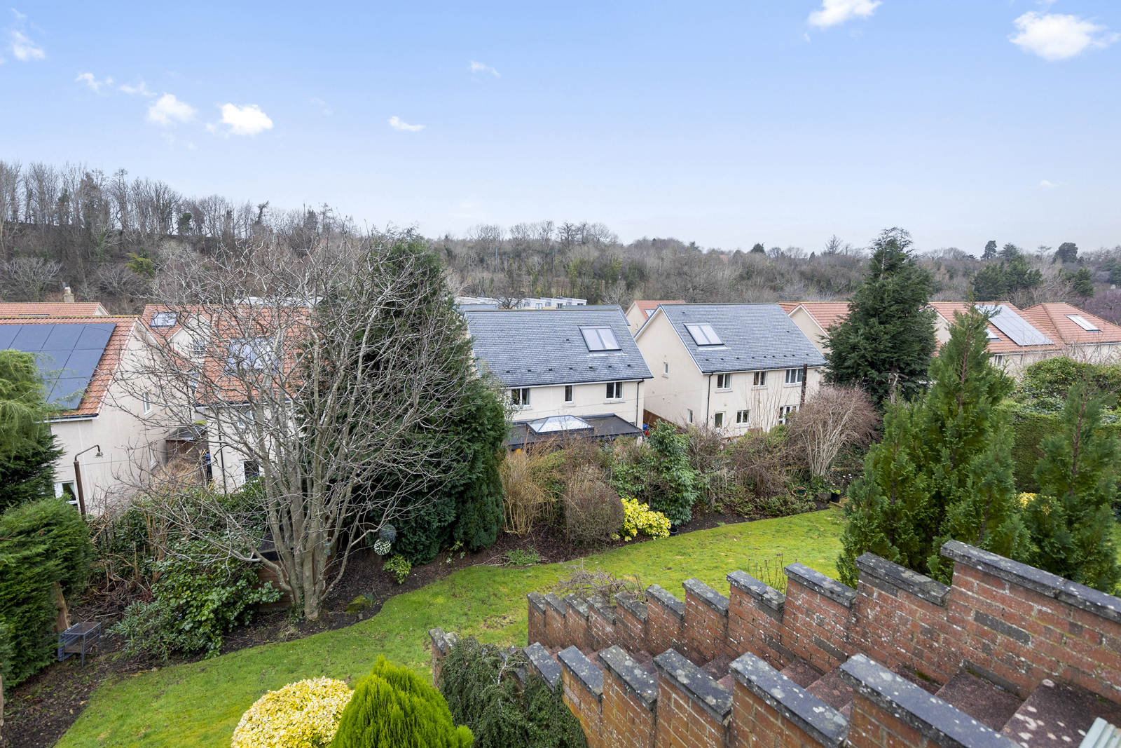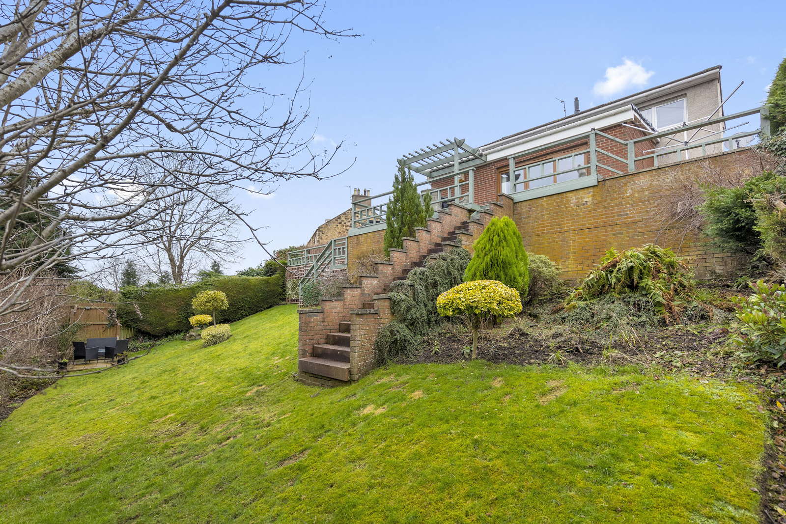 Externally, there is a large driveway which can host two cars, a garage with up and over door, access on both sides of the house, front garden which is fully slabbed and low maintenance. The side garden is laid with chipped stones and is used as a drying area currently. Immediately to the rear of the family room is a lovely decked area, providing uninterrupted views over the park and woodland below. This split level deck is the perfect spot for alfresco dining or entertaining and leads to the garden which sits below. Two separate sets of steps give access to the vast garden ground at the rear, well presented with lawn, shrubs, bushes and small tress all impressively maintained.